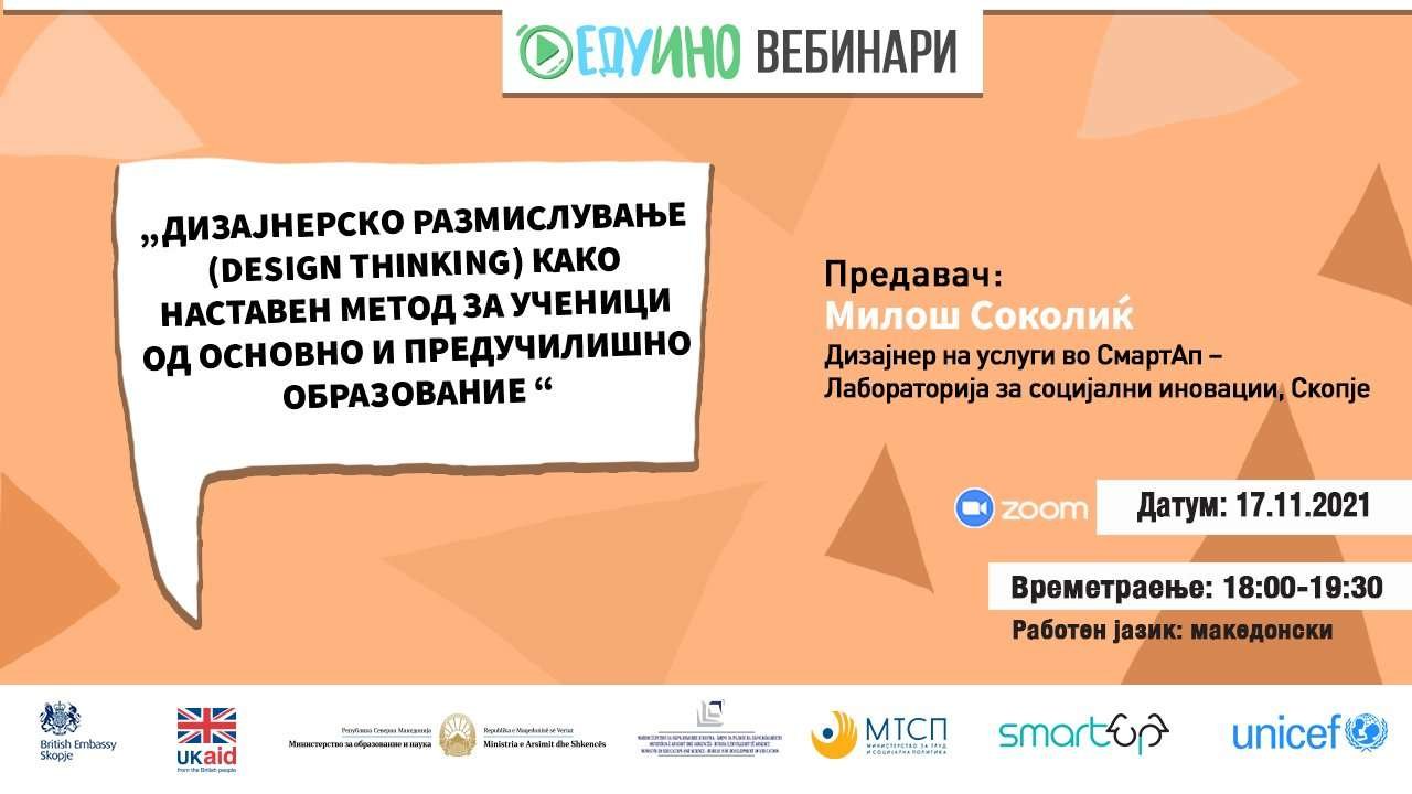 Во иновативната и трендовска педагогија се поголема е тенденцијата дизајнерското размислувањето да се вклучува како метода во наставата. На овој вебинар ќе бидат презентирани практични примери како преку активности во училницата да се имплементира дизајнерското размислувањето во наставната методологија. Во централниот дел ќе го објасниме потеклото на методологијата на дизајнерското размислувањето, кои се нејзините придобивки и кои се чекорите и методите на овој процес. Потоа, ќе се навратиме на принципите на методологијата и уште еднаш ќе ги повториме чекорите на процесот. Во практичниот дел на семинарот ќе ги изложиме предизвиците и предностите на методологијата дизајнерско размислување. Најзначајните сознанија на оваа тема ќе ги споделиме во главниот дел, преку презентација на две студии на случај во кои е применета оваа метода во наставата. Во овој сегмент ќе посочиме конкретни примери од практичната примена на методот во наставата.