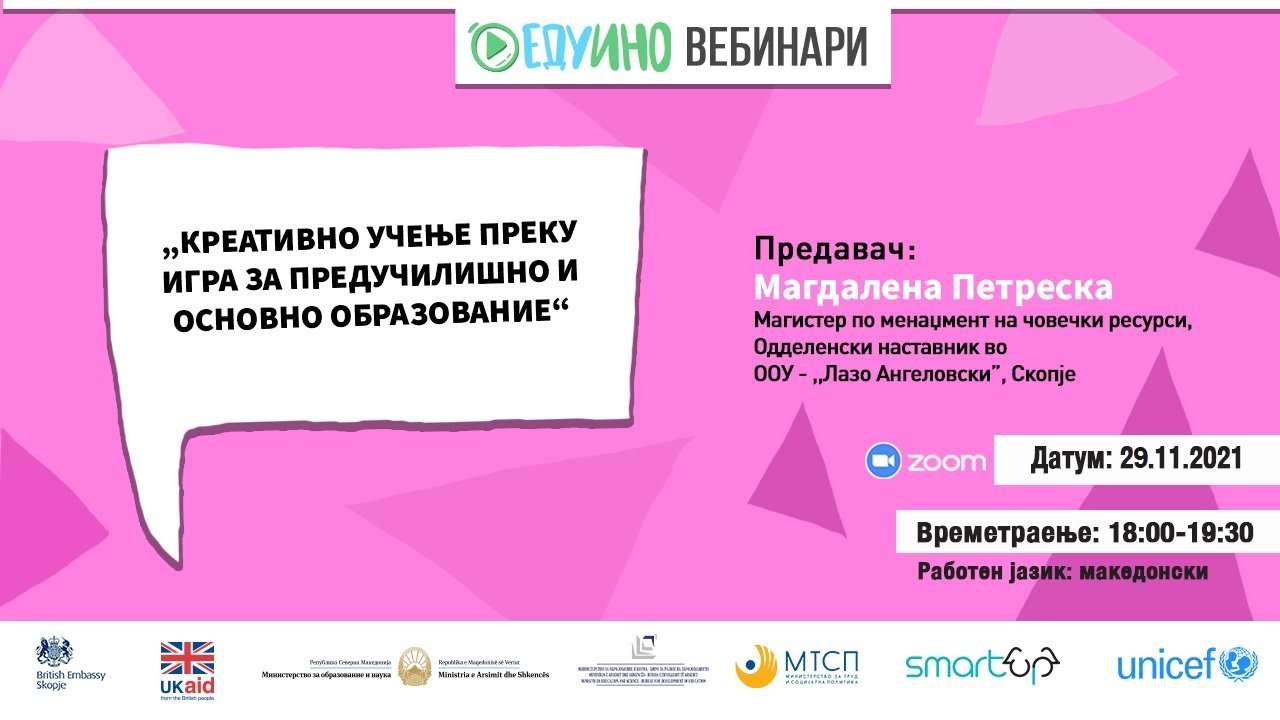 Креативното учење преку игра е една од основните потреби на учениците од предучилишното и основното образование, пред се поради тоа што помага во развојот на нивниот емоционален, физички, ментален и социјален развој. Преку педагошки методи во кои е вклучена играта тие учат за светот кој ги опкружува, стекнуваат искуства, откриваат, поставуваат прашања и бараат одговори, експериментираат, креираат, ги развиваат сетилата, вештините и интелектуалните способности.