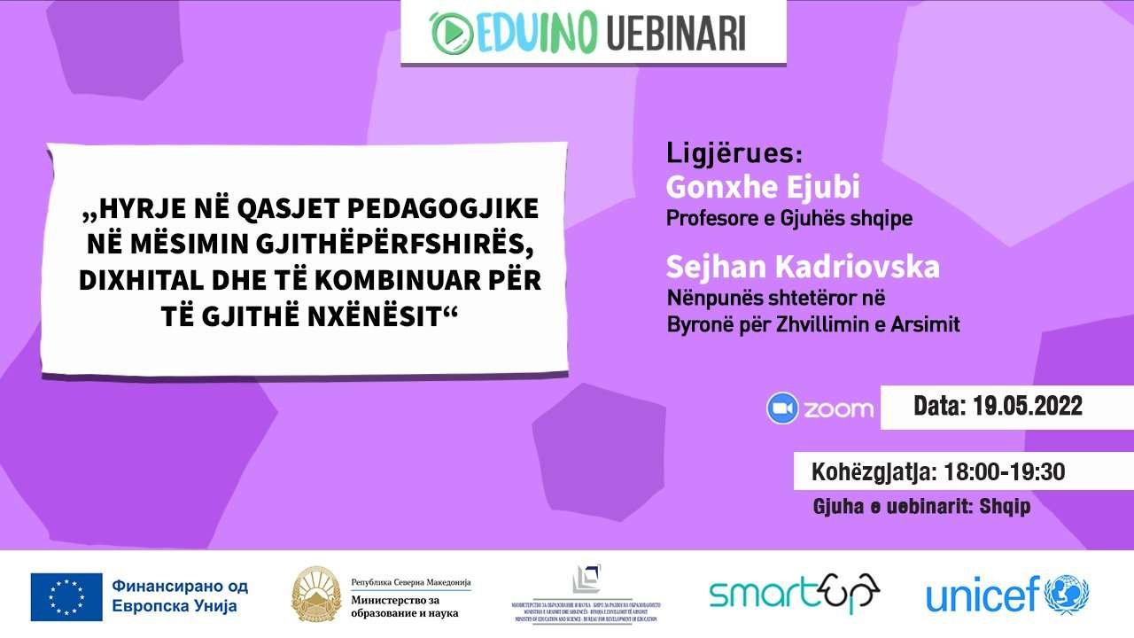 Ky webinar është i dedikuar për mësuesit e shkollave fillore dhe të mesme të cilët dëshirojnë të prezantojnë qasjet dhe strategjitë efektive pedagogjike për të mësuarit gjithëpërfshirës, digjital dhe të kombinuar në mësimdhënie. Webinari është një hyrje në temë dhe ofron një përmbledhje të koncepteve kryesore që shpjegojnë ndryshimet në të nxënit, si dhe implikimet e tyre për planifikimin dhe zhvillimin e mësimdhënies gjithëpërfshirëse.педагошки методи.