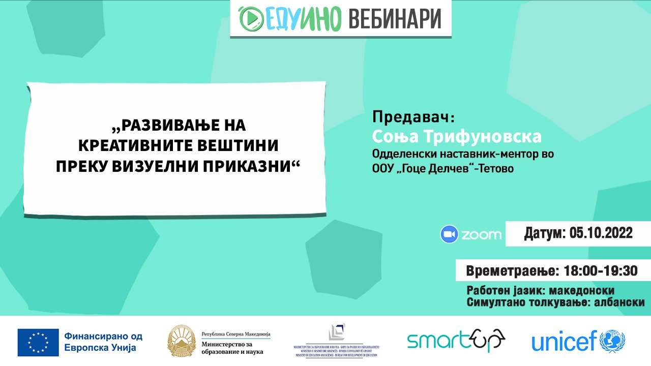 Современите педагошки и комуникациски истражувања го потенцираат значењето на креативната визуелна комуникација, пред сѐ, поради несомнено поголемиот степен на ангажираност и вклученост на учениците во содржината. Визуелните приказни преку создавање емпатија и поврзаност го втурнуваат ученикот во материјата која му ја предавате. Така, тие се идентификуваат со темата и идејата на емотивно ниво, при што стануваат мотивирани и инспирирани за учество на часот. Преку практични примери и конкретни постапки за креирање визуелни приказни и со примена на различни видови медиуми: слики, фотографии, илустрации, стрипови, видео блогови и слично, слушателите на вебинарот ќе научат како да ги развиваат креативните вештини кај учениците.
