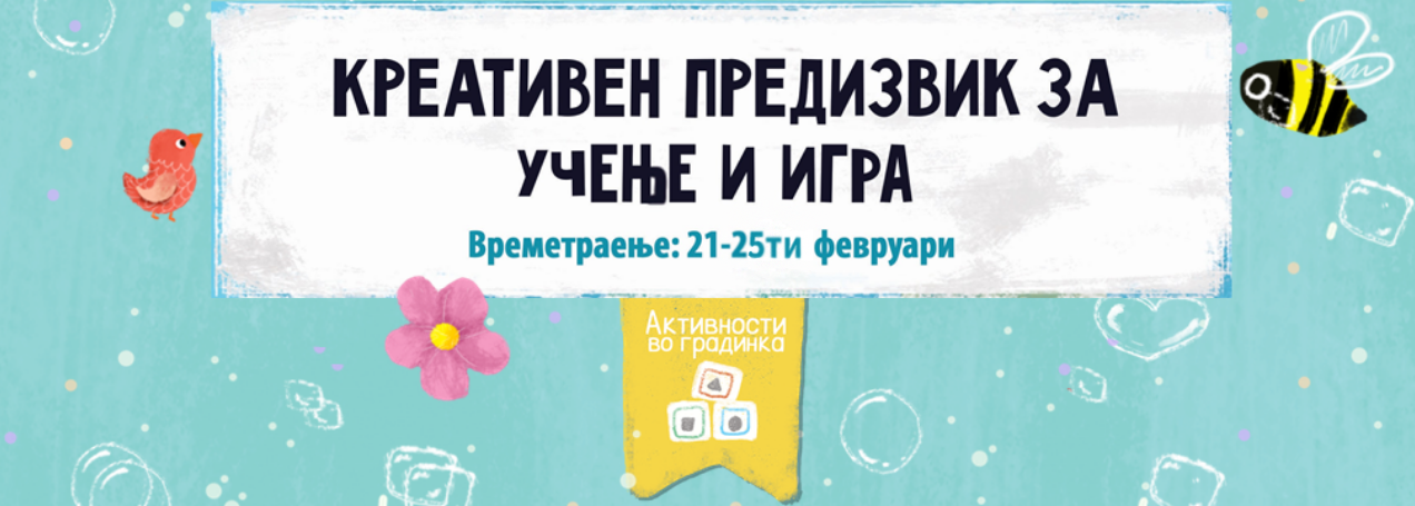 Важно: Активностите селектирани за предизвикот може да ги реализирате во текот на целиот предизвик од 21-25.02.2022г . Пријавите може да ги праќате без разлика која е активноста на денот: на пр. активноста „Еј, ти каде ли се скри?”може да ја направите и да ја поднесете на 22.02.2022г, иако е промовирана како прва активност.
