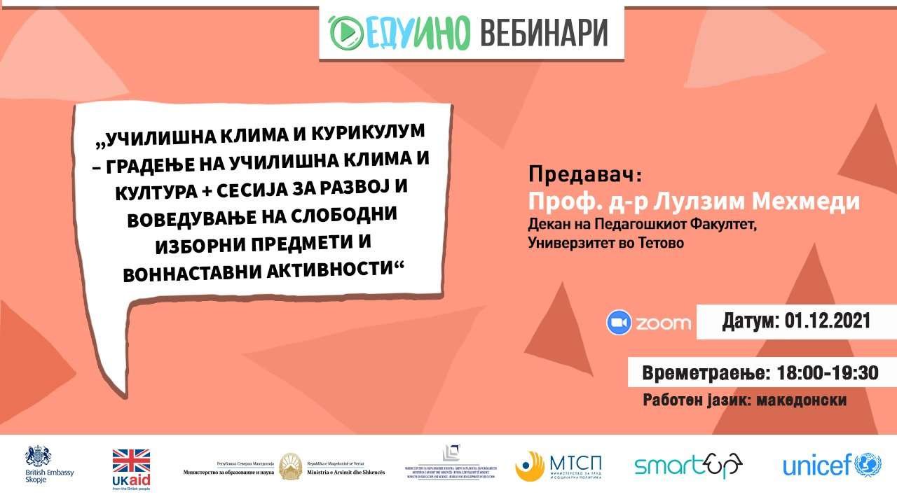 Дизајниран за поддршка и унапредување на работата на училишното раководство, овој вебинар ќе биде поделен на две тематски целини. Во нив ќе биде објаснет и разјаснет концептот за локален курикулум и култура. Училиштата како основни градивни елементи на образовниот систем, неопходно е да се охрабрат да креираат средина за учење, раст и развој која најдобро ги отсликува вредностите, потребите и можностите на училиштето и непосредната заедница.